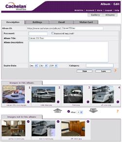 The same pictures can grouped into different albums for multiple applications. A feedback link is available for receiving an email response from visitors. Counters show how many times an album has been viewed. Each album is assigned its own unique web address in the format myalbum.cachelan.com